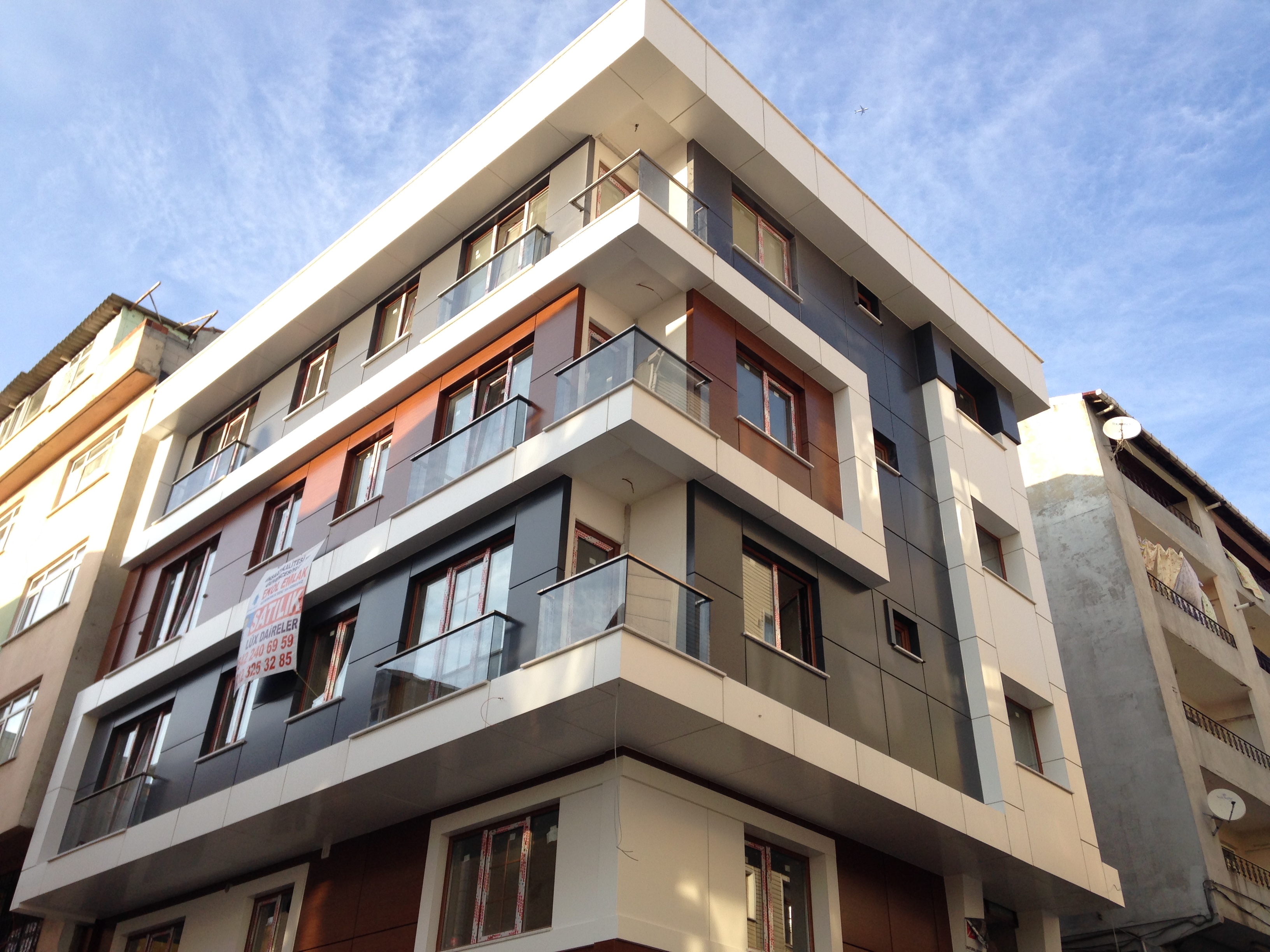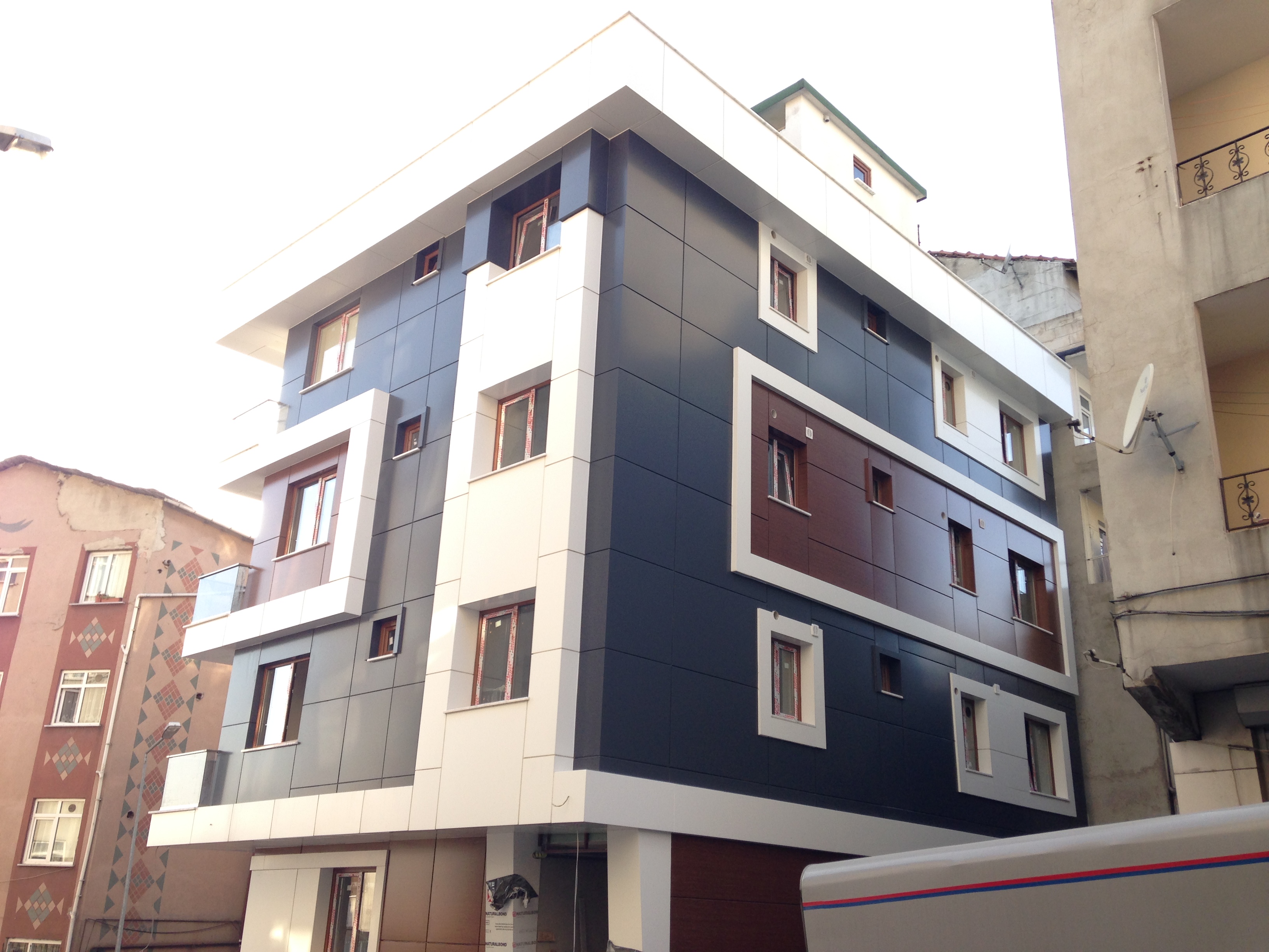 İstanbul’daki EMSA İnşaat projesi, modern dış cephe tasarımı ve dikkatlice seçilmiş malzeme kombinasyonları ile dikkat çekiyor. Antrasit gri, beyaz ve ahşap desenli kompozit kaplama malzemeleri, cephede estetik bir denge yaratırken, camlı küpeşte korkuluklarıyla şıklığı artırıyor.